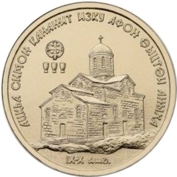 Опис: У центральній частині монети — зображення Нового Афонського собору Святого Симона Зілота, апостола, у верхній лівій частині — зображення хреста та посудин для води — символів святого Симона Зілота, у верхній центральній частині монети — напівкруглий напис абхазькою мовою «Ацқьа Симон Кананит изку Афон Ҿыцтәи аныха» (Новий Афонський собор святого Симона Зілота, апостола). Напис під зображенням собору вказує дату будівництва.