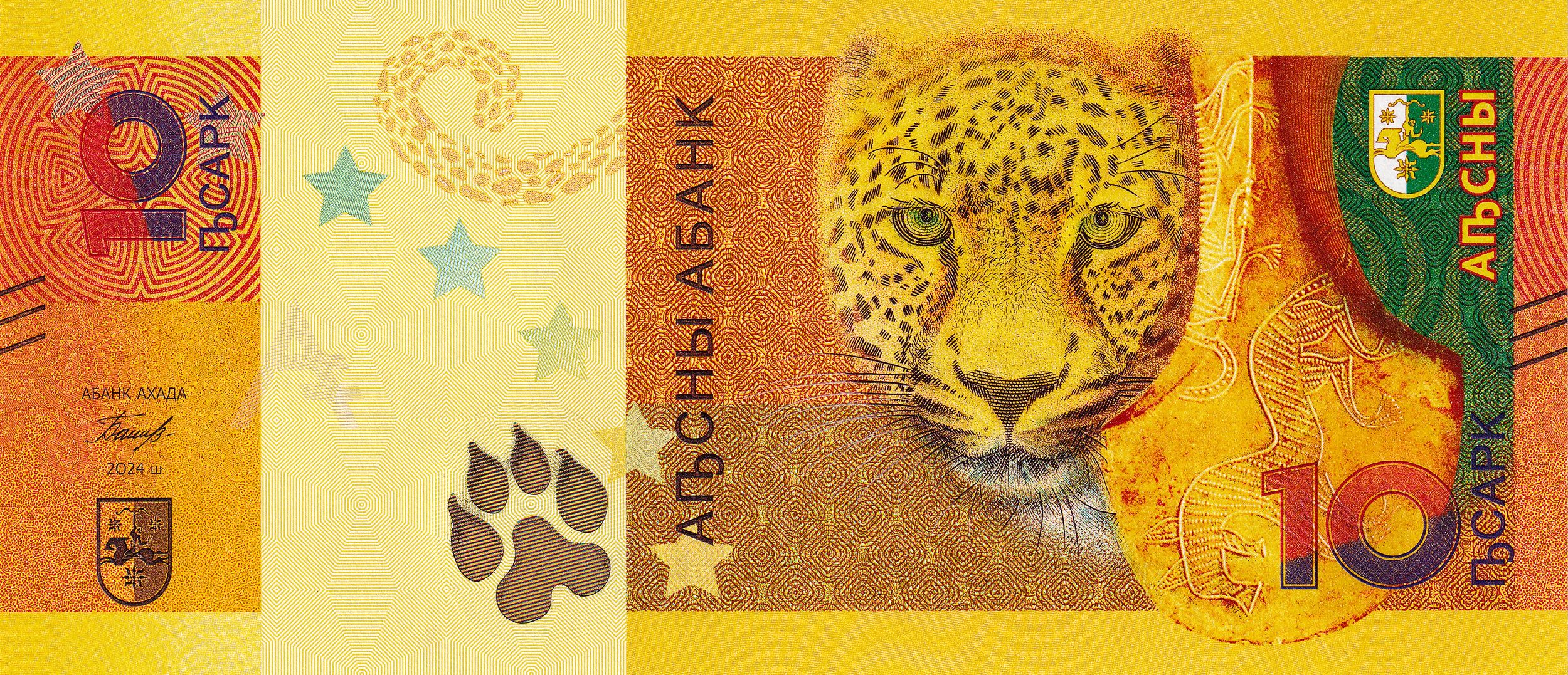 Опис: Головне зображення на аверсі банкноти складається із зображення кавказького леопарда (Panthera pardus tulliana) та оздобленої стародавньої бронзової сокири. У правій та лівій частинах розміщені зображення державного герба Республіки Абхазія та номінал банкноти.