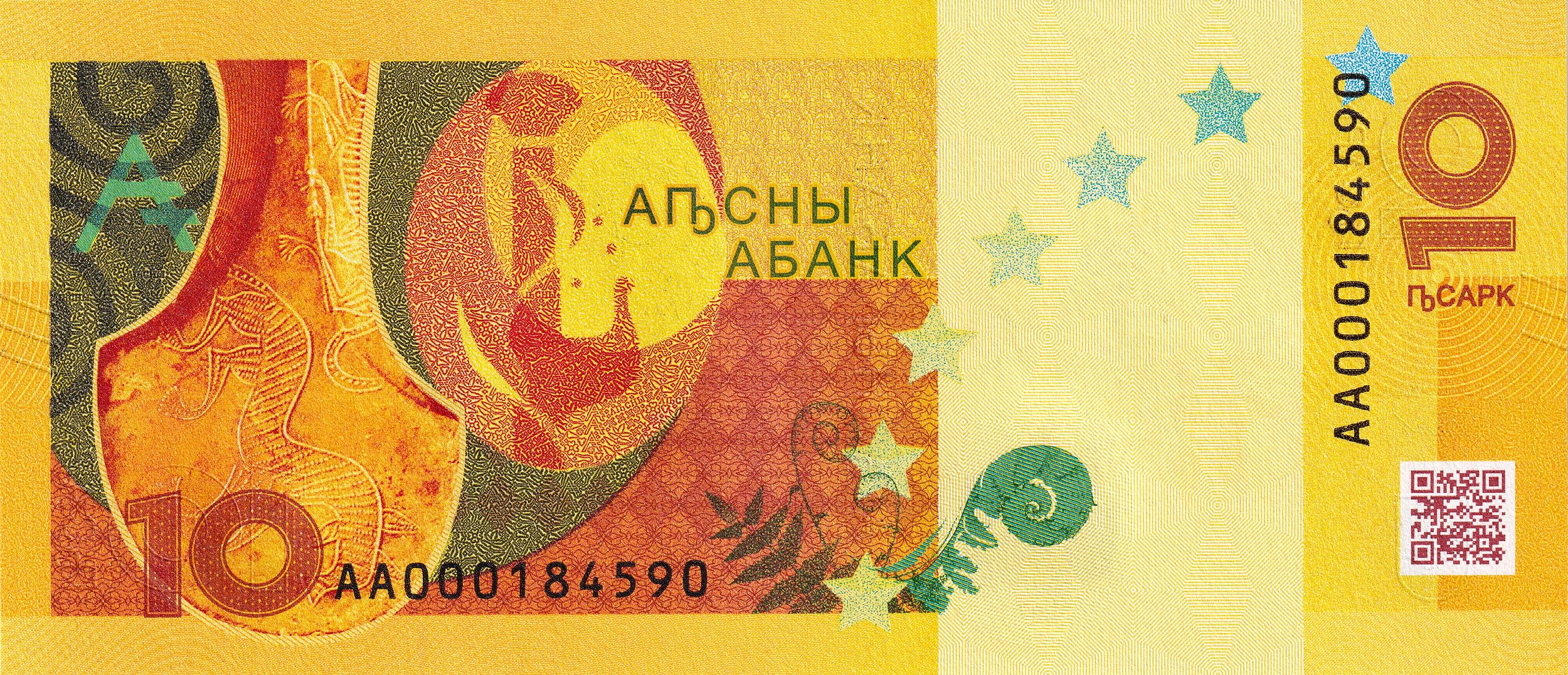 Опис: Основне зображення на зворотному боці банкноти складається із зображень бронзової сокири та верхньої частини традиційного абхазького військового та ієрархічного жезла «алабаша». На зворотному боці також вказано номінал та серійний номер банкноти.