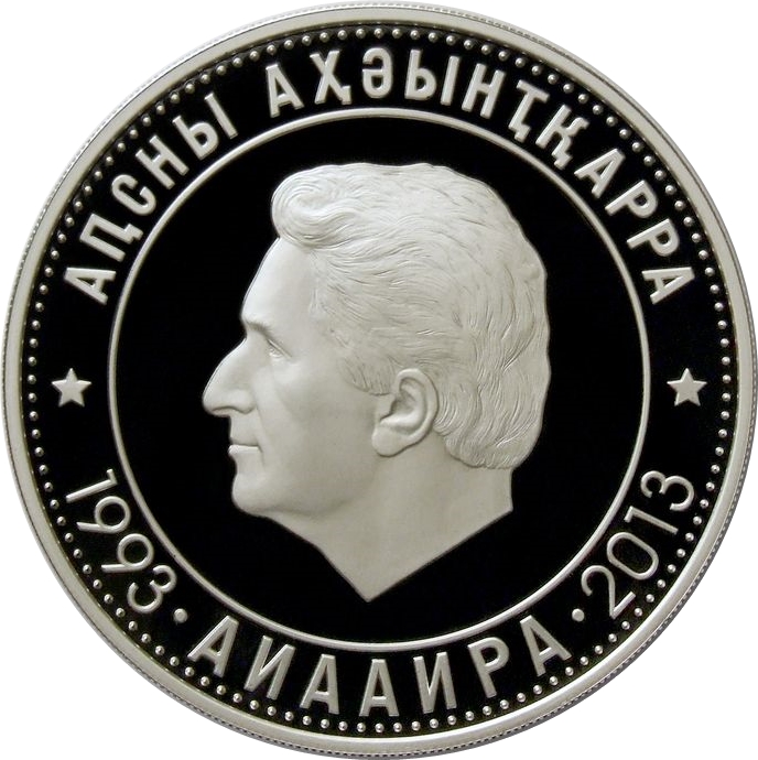 Опис: На внутрішньому диску зображено профільний портрет Ардзінби В. Г., головнокомандувача Збройних сил Республіки Абхазія в період Вітчизняної війни народу Абхазії 1992-1993 рр., першого президента Республіки Абхазія. На зовнішньому диску розміщені написи абхазькою мовою, розділені крапками: у верхній частині – «Республіка Абхазія», у нижній частині – напис «Перемога» та роки «1993» і «2013». По периметру монети проходить пунктирна рамка.
