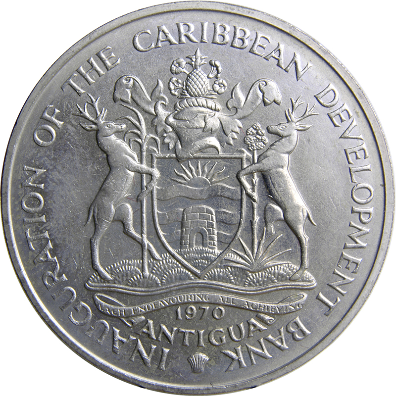 Опис: У центрі зображено герб Антигуа і Барбуди, під ним — дата, а по краю — написи.