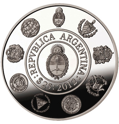 Опис: Дизайн, спільний для всіх валют, що входять до цієї серії, центральний герб Аргентини та написи «REPVBLICA ARGENTINA», номінал «$ 25» та рік карбування «2012» виділені в центральній частині. Навколо нашого герба розміщені щити всіх країн-учасниць.