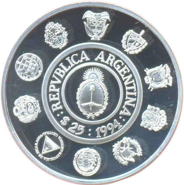 Опис: На зворотному боці монети зображено номінальну вартість «$ 25», рік карбування «1994», напис «REPVBLICA ARGENTINA» навколо державного герба, а зовні навколо напису — ескудо інших країн, що входять до випуску.
