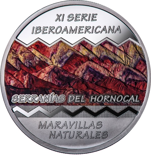 Опис: Центральний малюнок — зображення ландшафту з написом «HORNOCAL SERRANÍAS»; у верхньому куті написано «XI SERIE IBEROAMERICANA», а в нижньому — «NATURAL WONDERS». Як обрамлення можна побачити синтез традиційного охоронця, типового для північного заходу Аргентини, який також нагадує морфологію рельєфу гір.