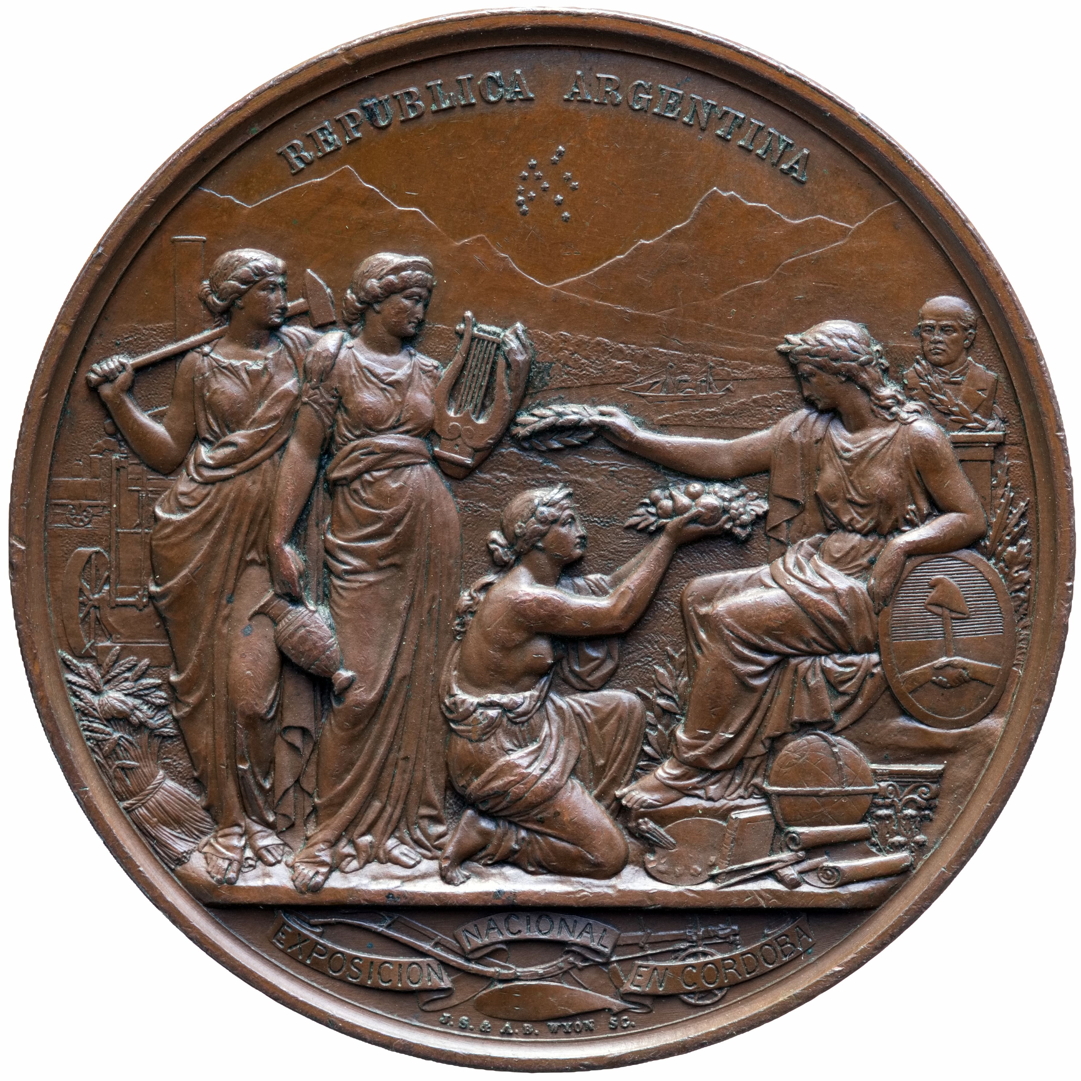 Опис: Алегорія науки, мистецтва та промисловості, що вручає щит жіночій персоніфікації Аргентини; бюст генерала Сармієнто