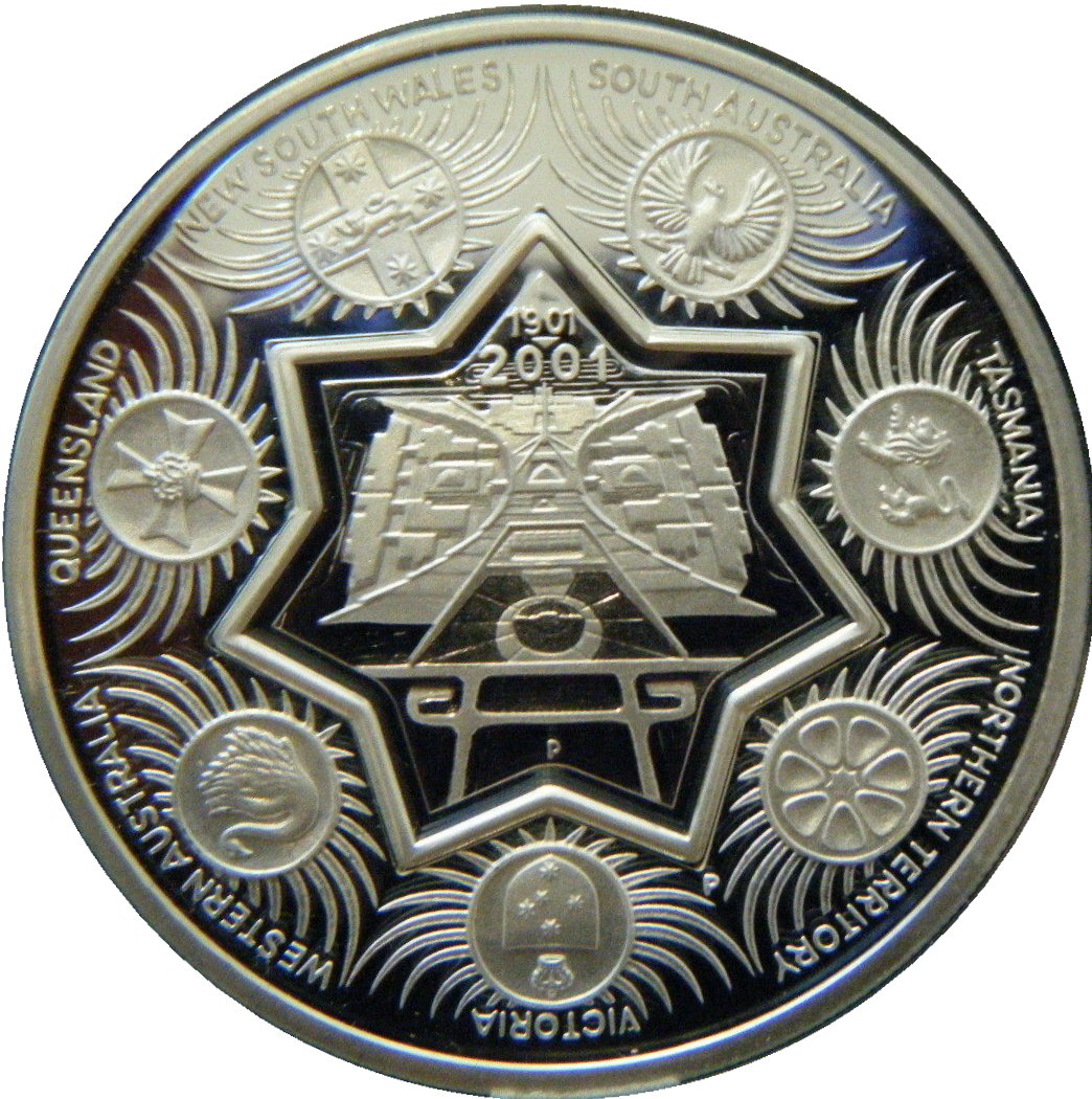 Опис: Емблеми 6 штатів і території розташовані навколо семикутної зірки. Усередині зірки зображено будівлю парламенту в Канберрі.