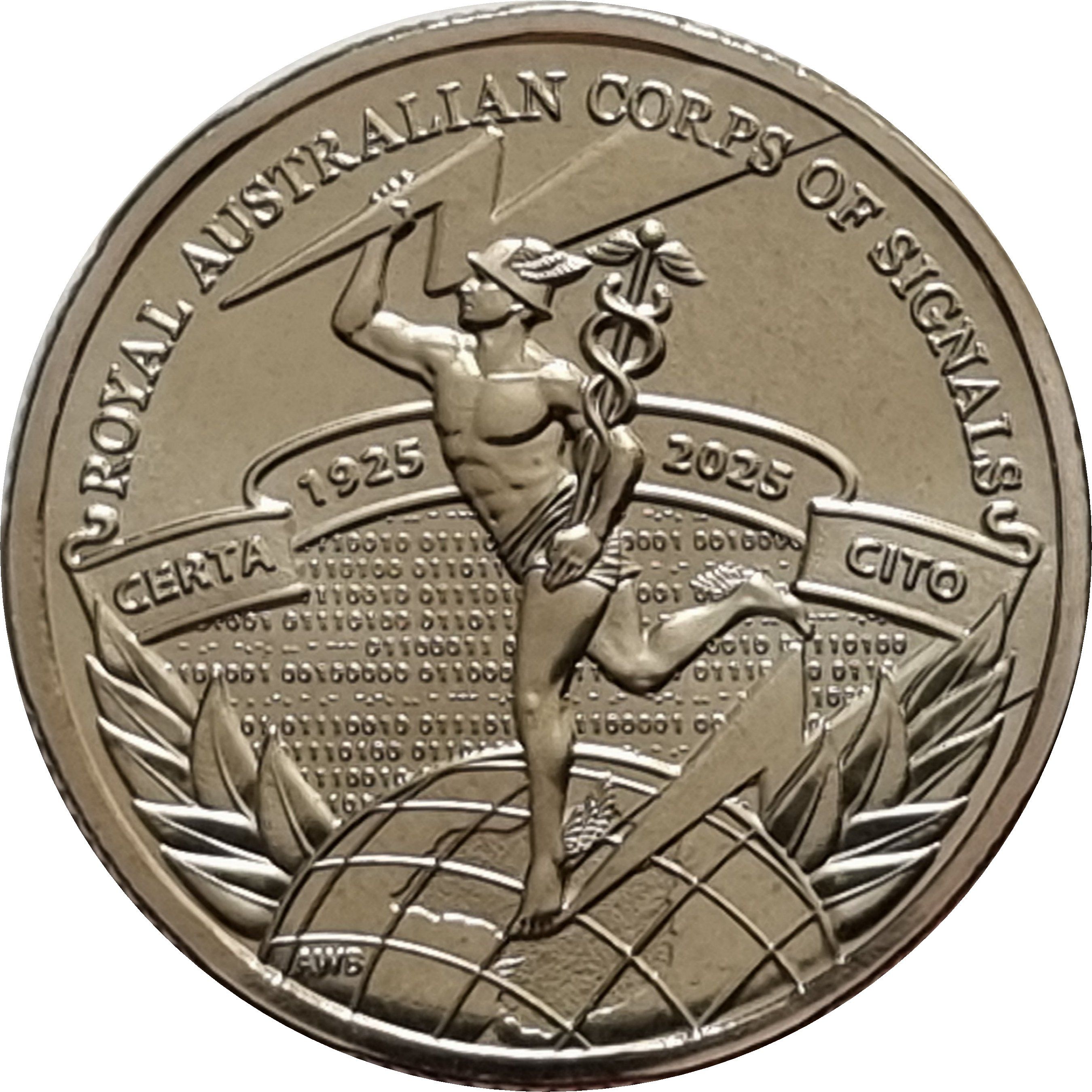 Опис: Крилатий бог Меркурій, що стоїть на глобусі у формі Австралії. Дві блискавки та вінок з листя. Все це на тлі морського та двійкового коду.