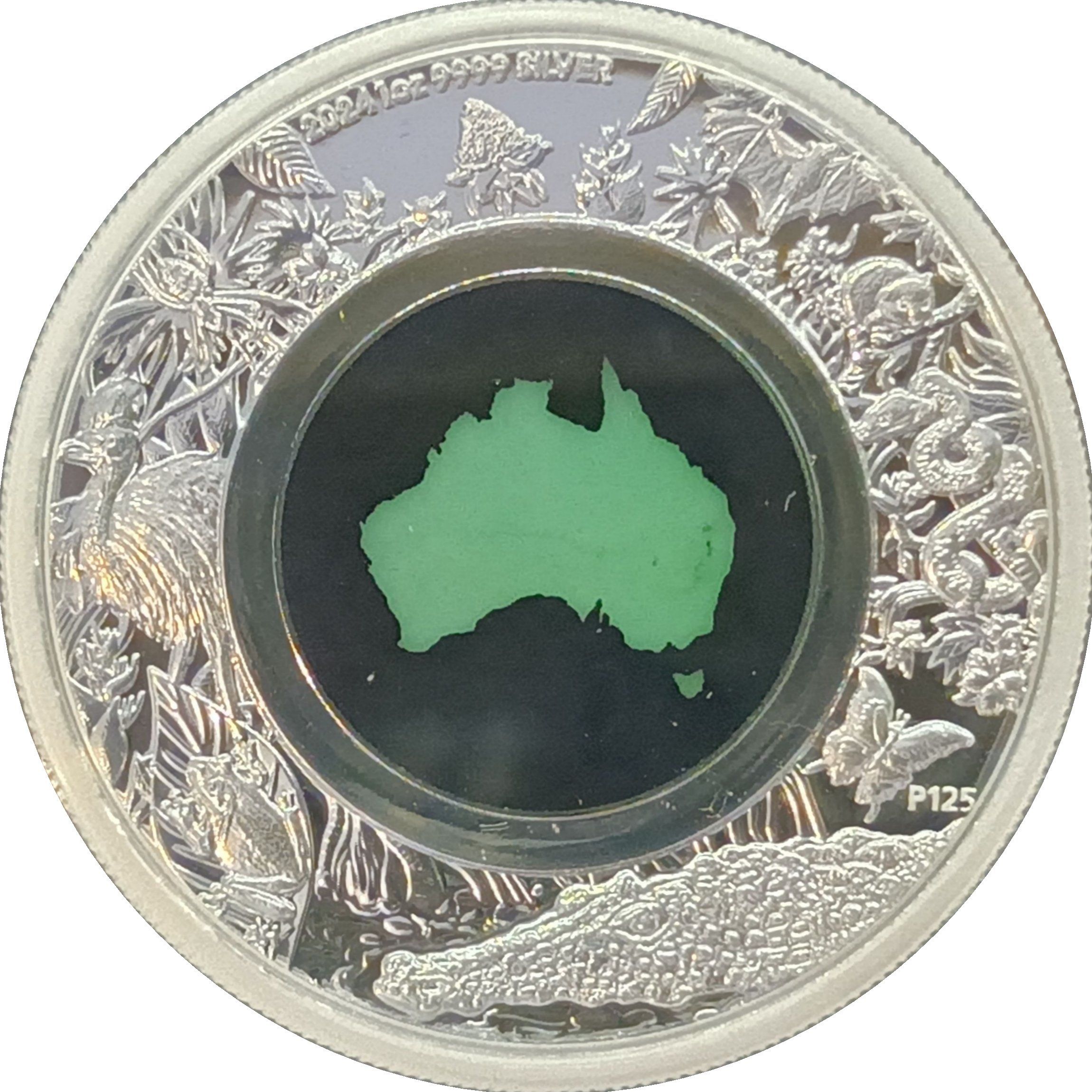 Опис: У центрі монети розміщено вставку у формі Австралії з хризопразу, дорогоцінного каменю, який отримав свій зелений колір завдяки нікелю. Зовнішня частина монети містить зображення різних представників австралійської флори та фауни.