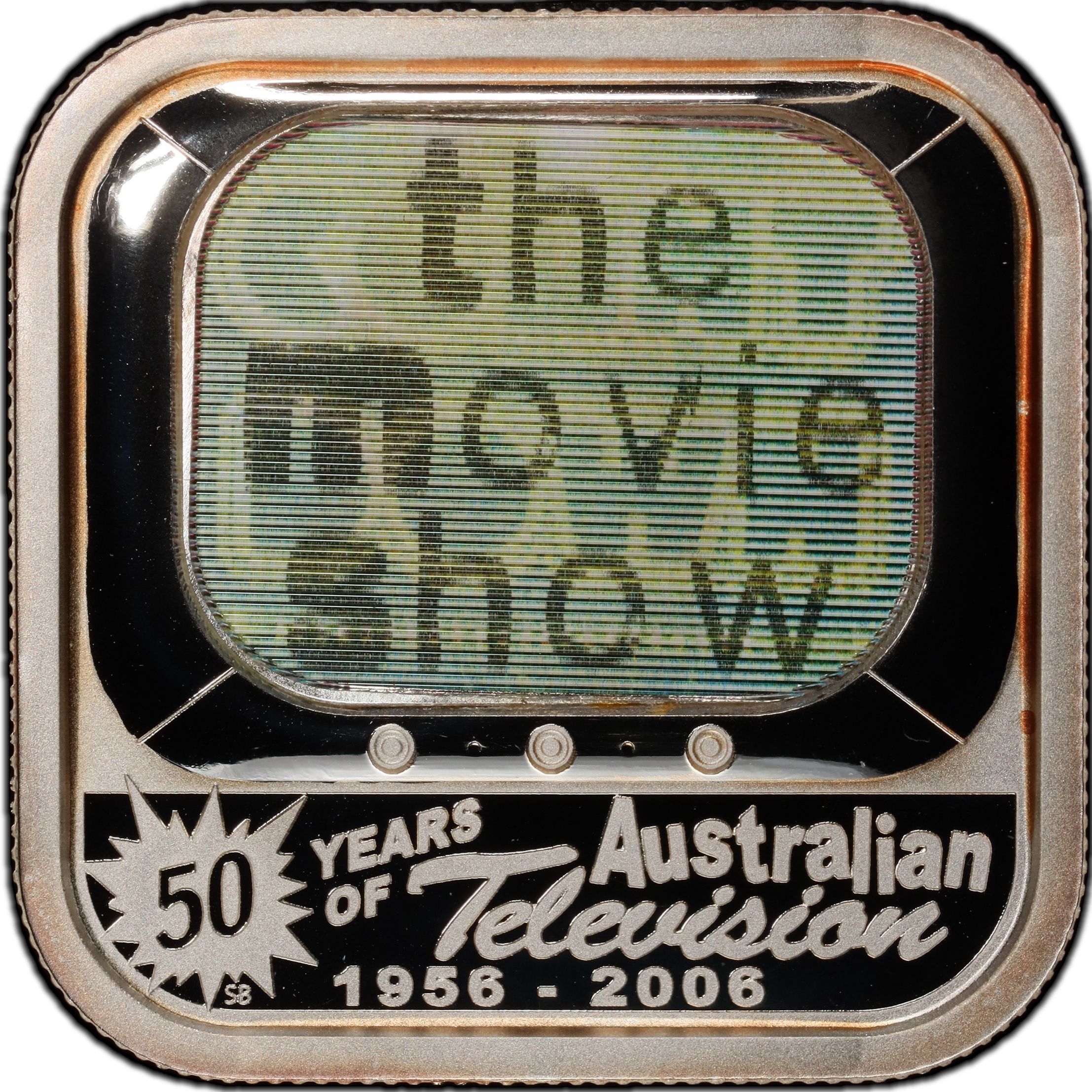 Опис: Лінзоподібний телевізійний екран з різними кольоровими зображеннями, пов'язаними з історичними австралійськими телепрограмами.