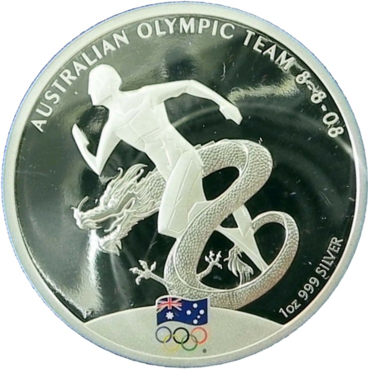 Опис: Спортсмен, що біжить вліво, а навколо нього кружляє китайський дракон. Внизу — кольоровий прапор Австралії та олімпійські кільця.