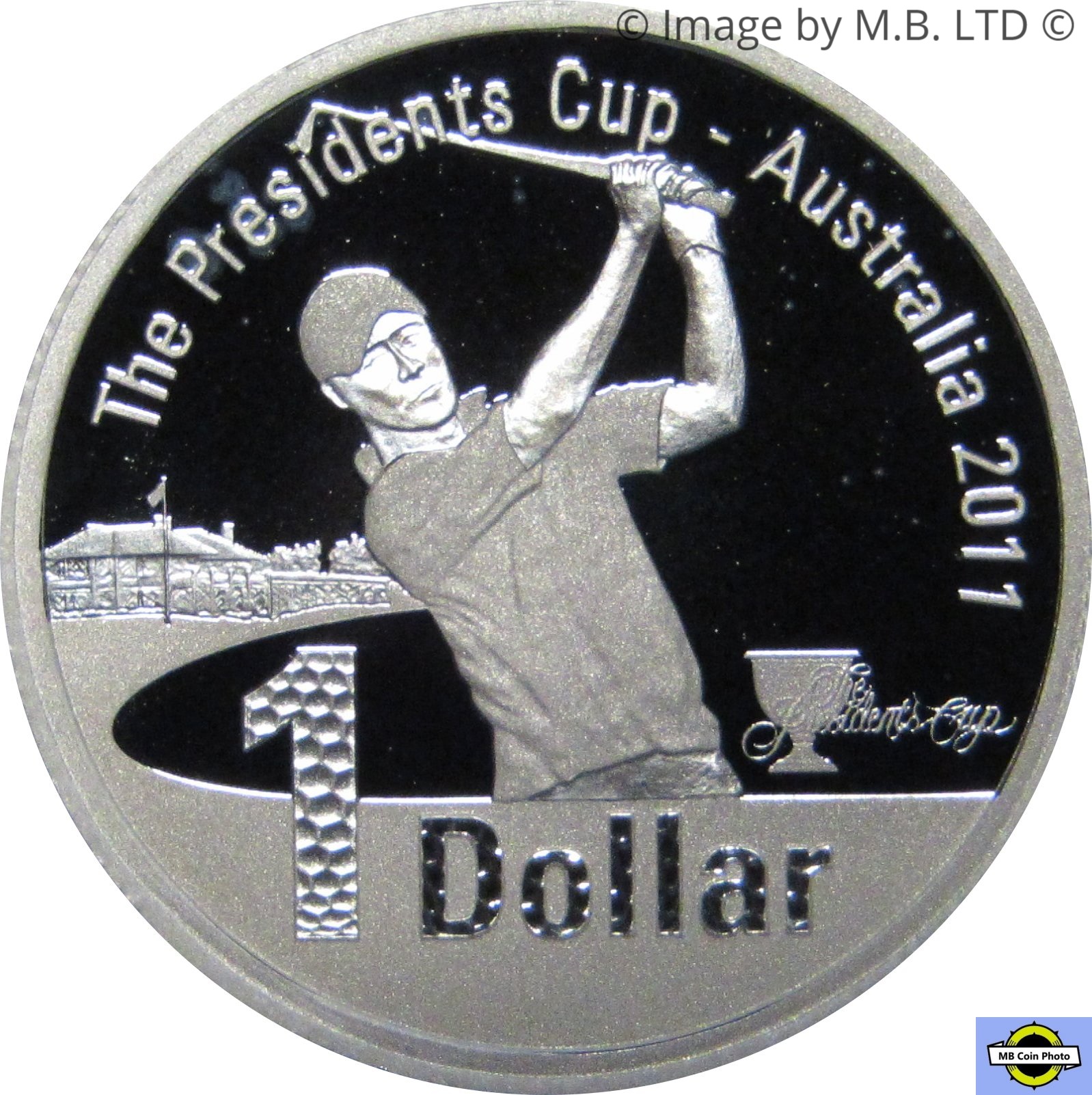 Опис: Зображення гольфіста, який робить удар з клубом на тлі клубу. Трофей і логотип Presidents Cup знаходяться поруч з гольфістом.