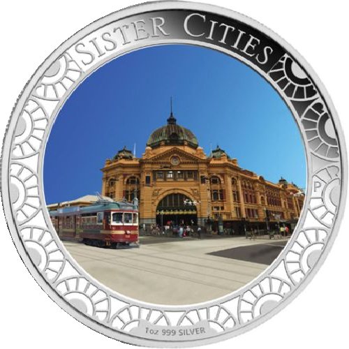 Опис: У внутрішньому колі зображено кольорове лінзоподібне зображення, яке змінюється між зображенням станції Фліндерс-стріт у Мельбурні та Адміралтейства в Санкт-Петербурзі. У зовнішньому колі розміщено текст.