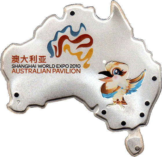 Опис: Маскот кукабарра в кольорі внизу праворуч. Крапки на карті Австралії позначають розташування столиць штатів і територій. Логотип Expo над текстом.