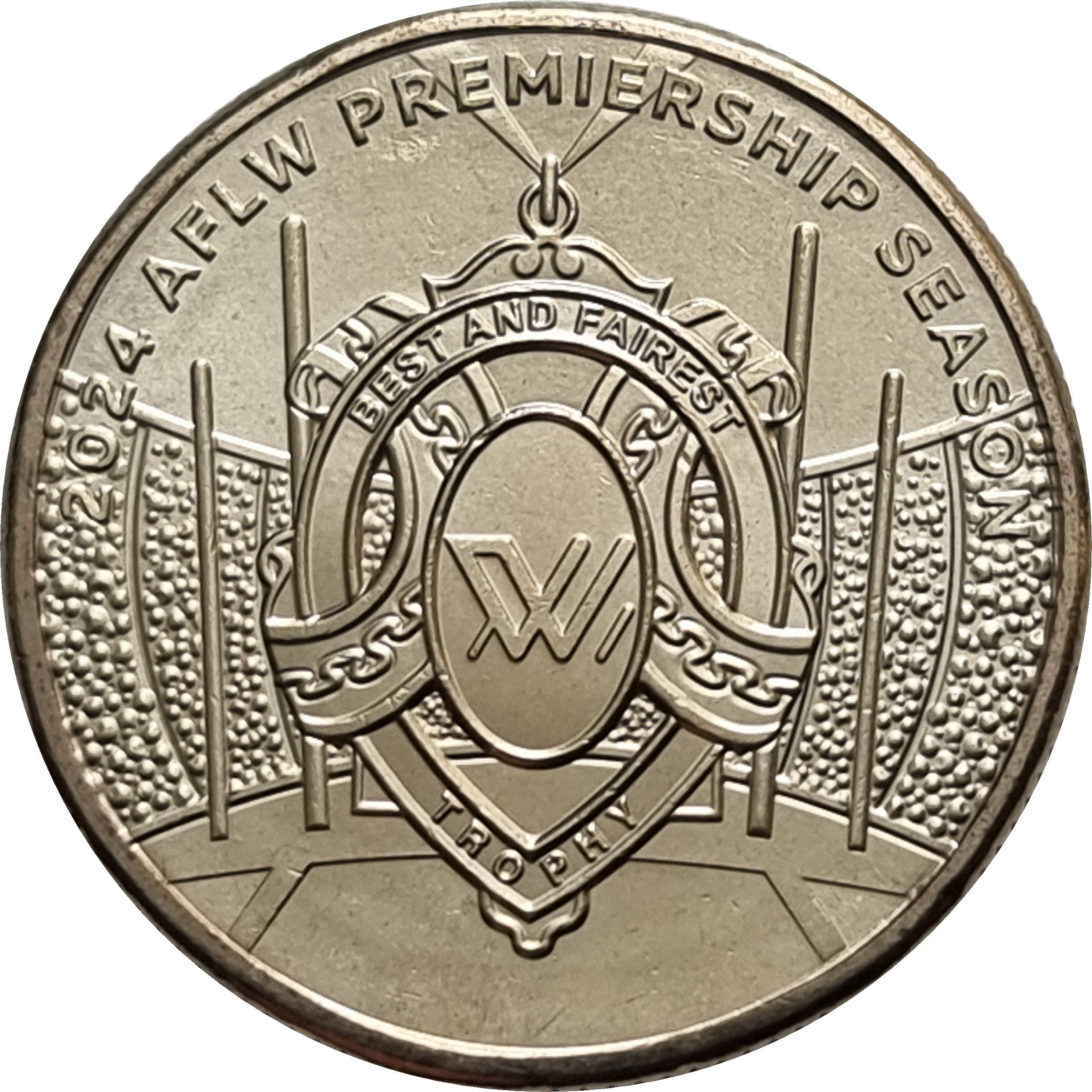 Опис: Медаль «Найкращий і найсправедливіший» перед чотирма воротами AFL. Логотип AFLW внизу.