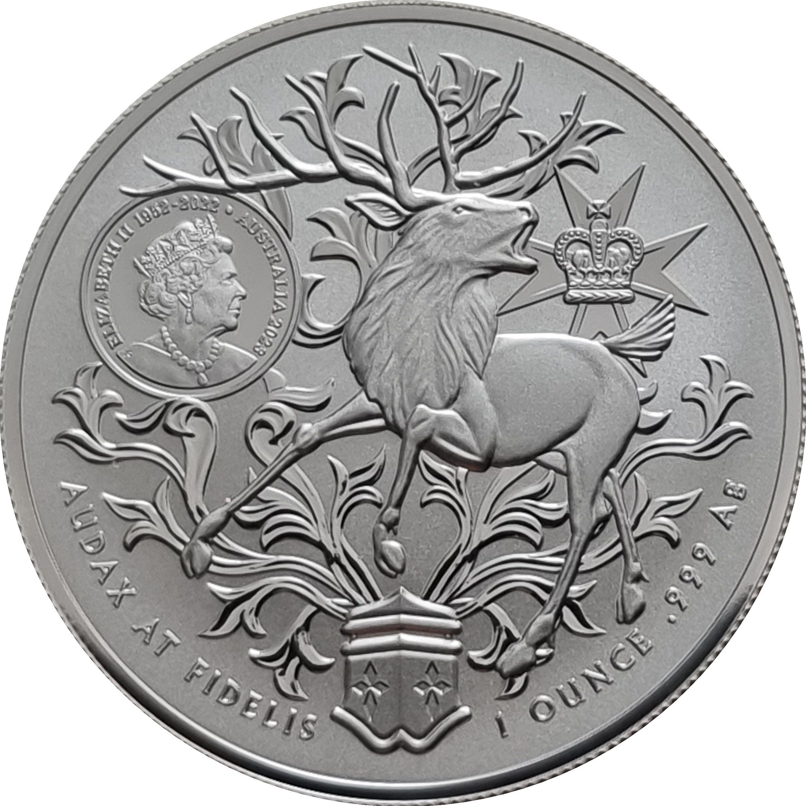 Опис: Червоний олень, частина герба Квінсленда, поруч із мальтійським хрестом. Меморіальний портрет Єлизавети II, автор Джоді Кларк, ліворуч. Вага та проба праворуч.