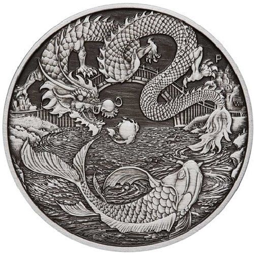 Назва: 1 долар — Єлизавета II (6-й портрет; На ім'я — Дракон і Кої — Срібна монета з ефектом старовини)