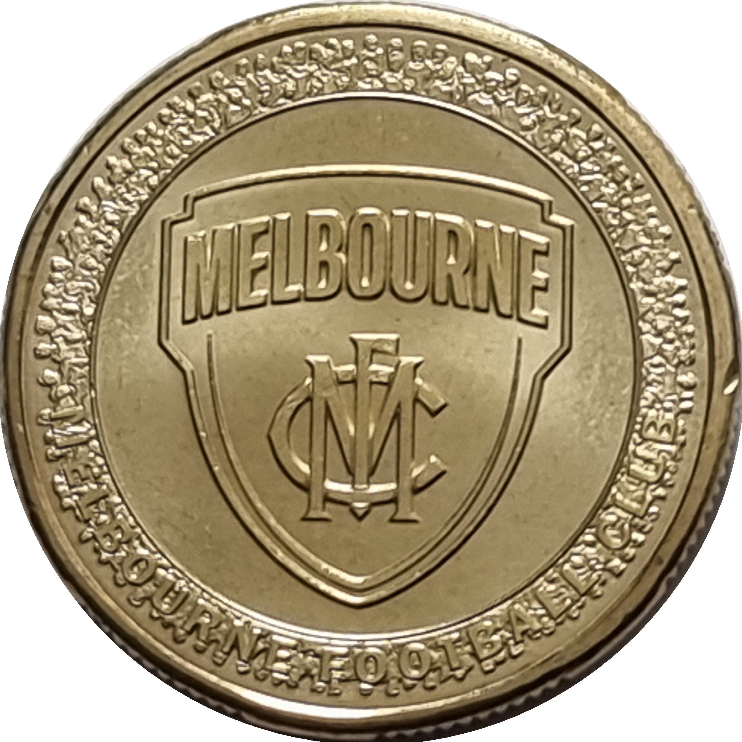 Опис: Логотип Melbourne Demons — щит із монтажем літер M F C, оточений глядачами у зовнішньому колі.