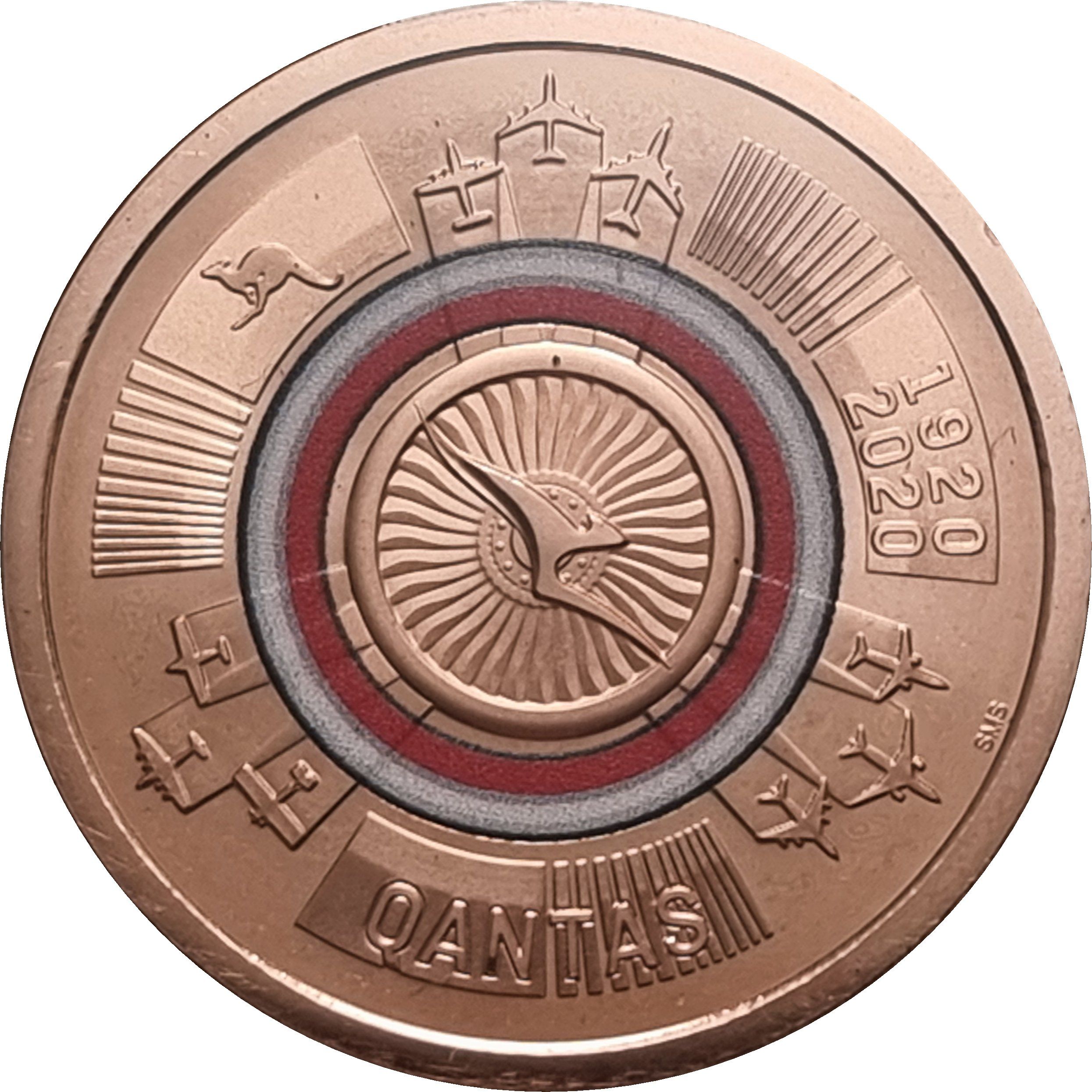 Опис: У внутрішньому кільці білого та червоного кольорів зображено логотип QANTAS Flying Kangaroo, накладений на лопаті вентилятора реактивного двигуна. За межами внутрішнього кільця зображено 9 різних літаків у групах по 3, які використовуються QANTAS для польотів. У верхньому лівому куті зображено кенгуру, праворуч — дати 1920 2020, а під ними — слово QANTAS .