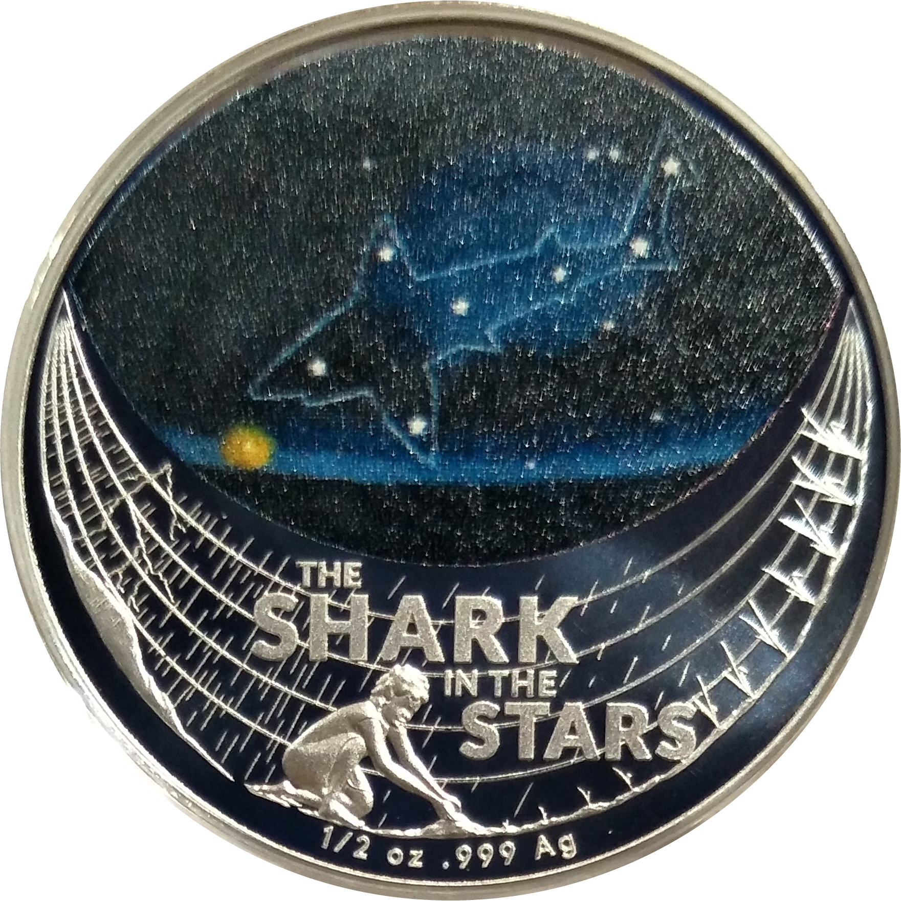 Опис: Зоряне нічне небо з контуром акули, намальованим навколо великих зірок, нижня половина монети зображує людину, яка стоїть на колінах у ландшафті.