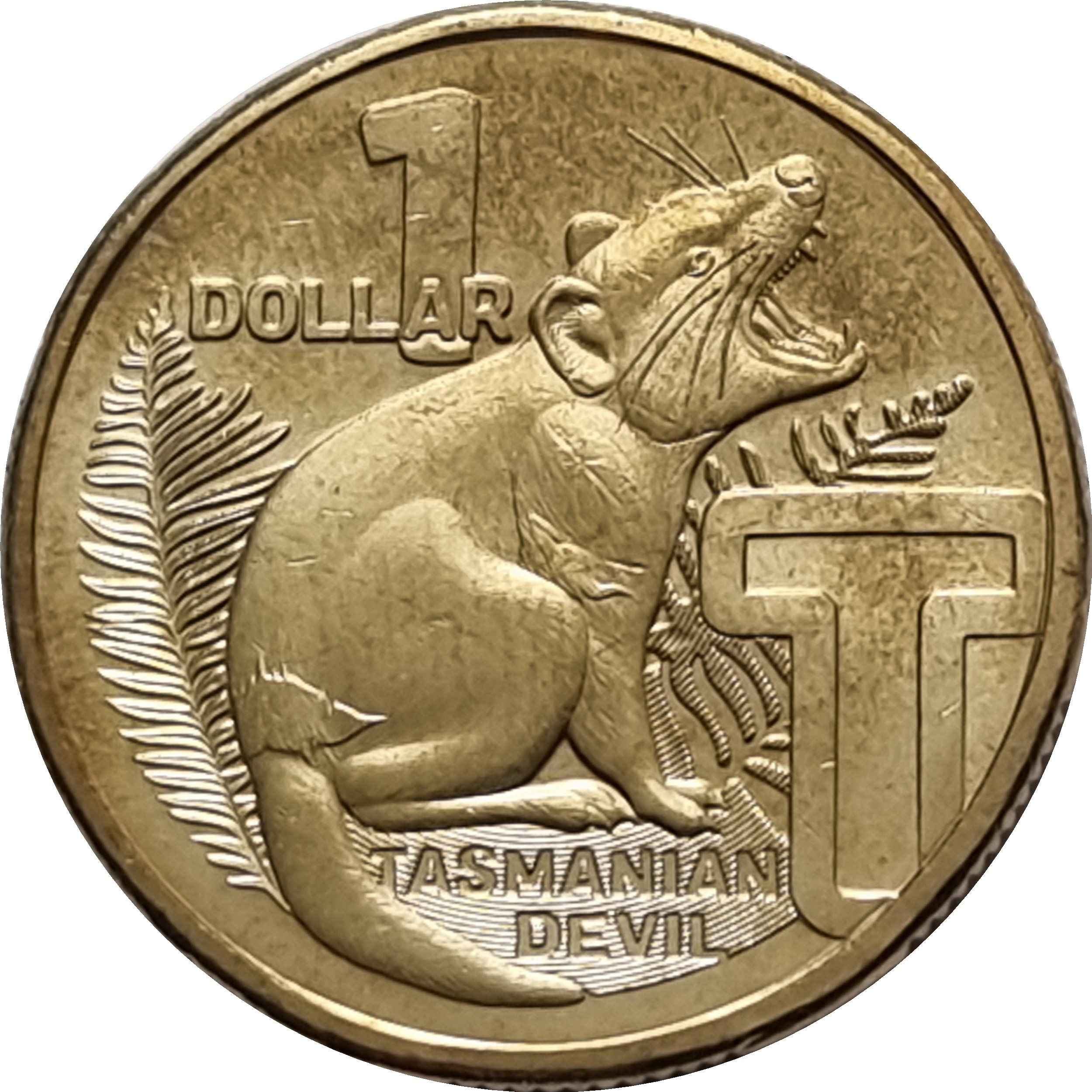 Опис: Тасманійський диявол, що дивиться вправо, з листям папороті позаду.