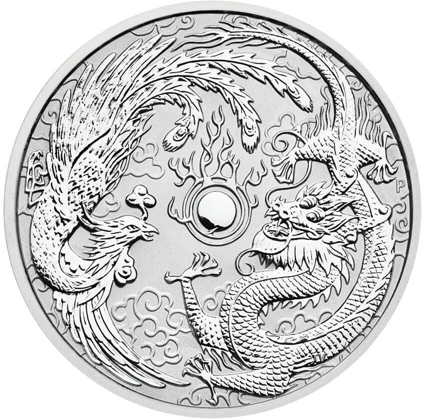 Опис: Дракон праворуч і фенікс ліворуч, обидва художньо вигинаються навколо краю монети.