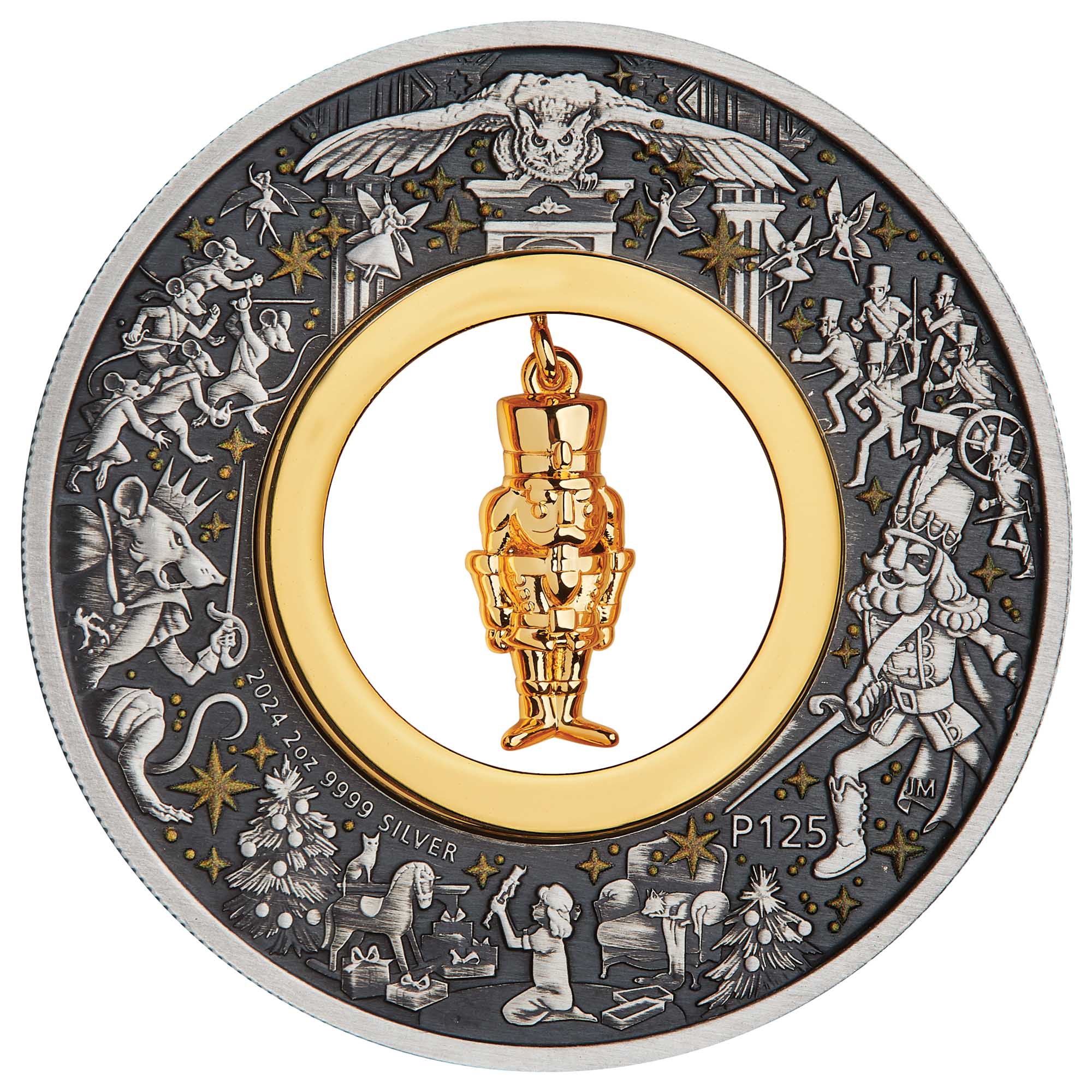 Опис: Персонажі сюжету, включаючи Лускунчика, його ворога Мишачого короля та дівчинку серед різдвяних подарунків. Також включені феї, різдвяні ялинки, сова, золотисті зірки.