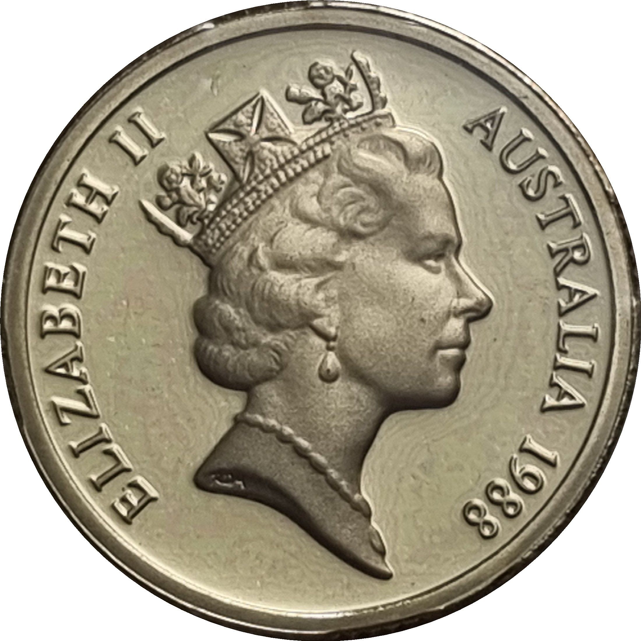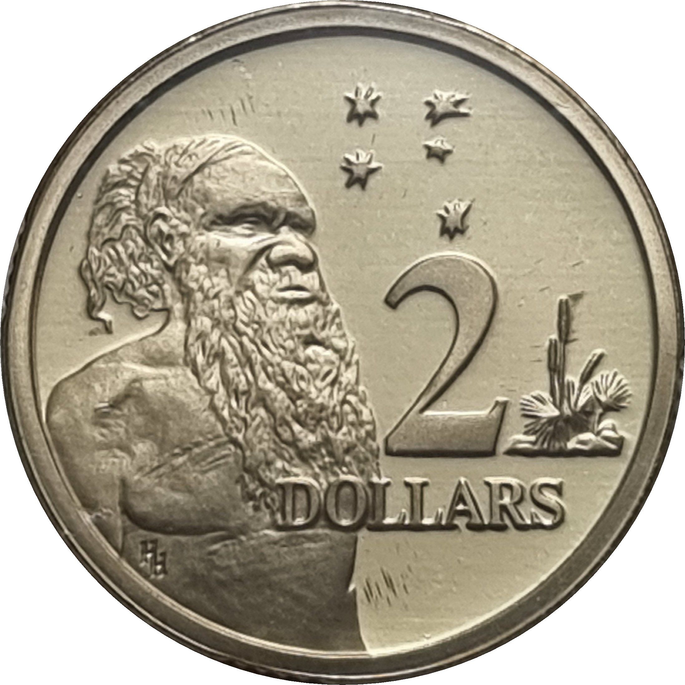 Опис: Зліва зображено півфігуру аборигена, зверху — Південний Хрест, праворуч — номінал, знизу — ініціали дизайнера, праворуч — трава-дерево.