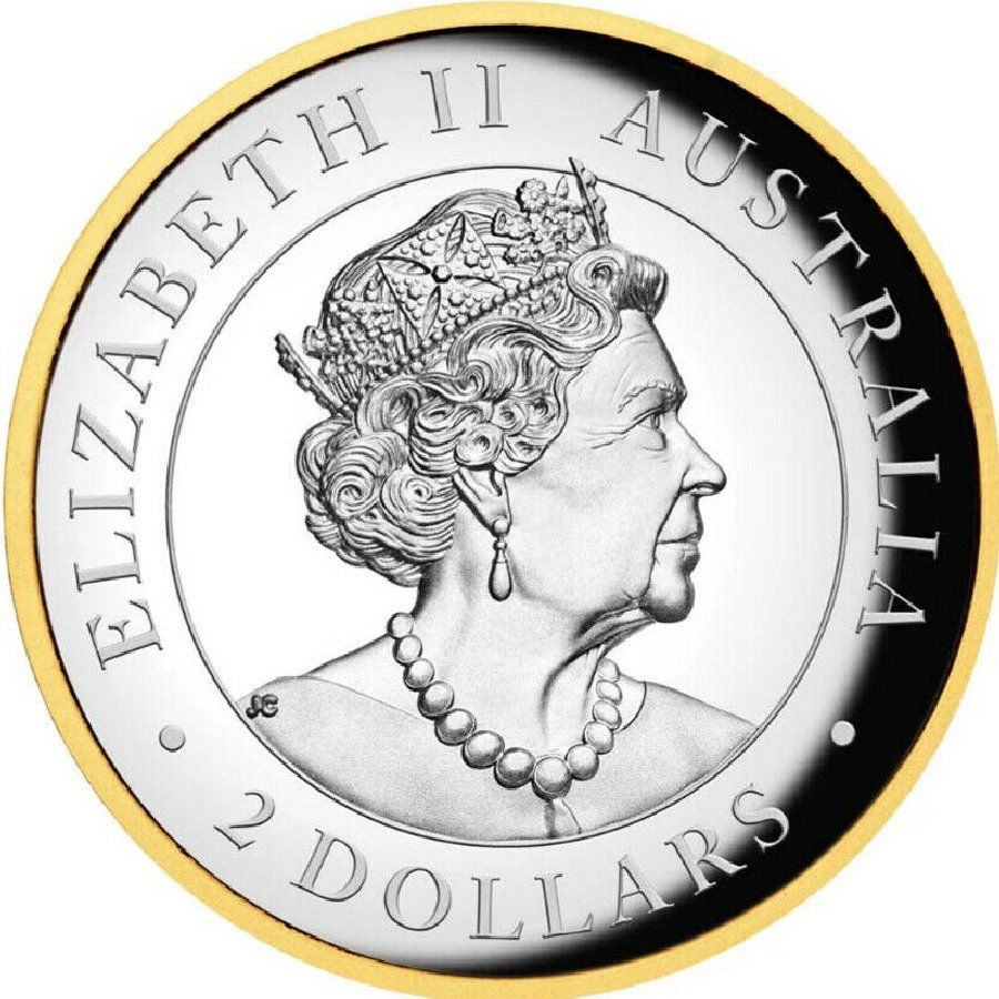 Назва: 2 долари — Єлизавета II (6-й портрет — австралійська кукабарра — срібна позолочена монета)