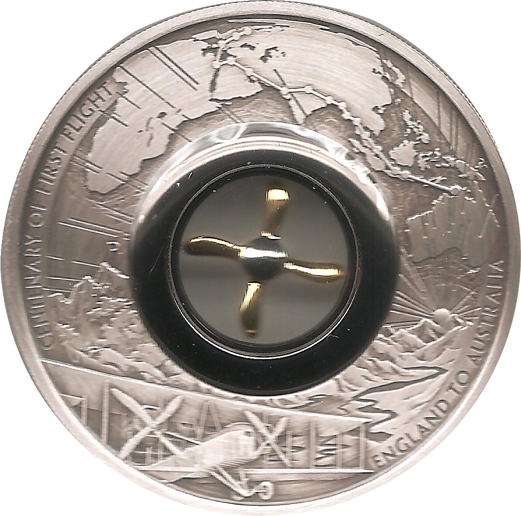 Опис: Карта з позначеним маршрутом польоту над ілюстрацією гірського ландшафту. На передньому плані зображено літак «Вікерс». У центрі монети розміщено вставку із зображенням пропелера.