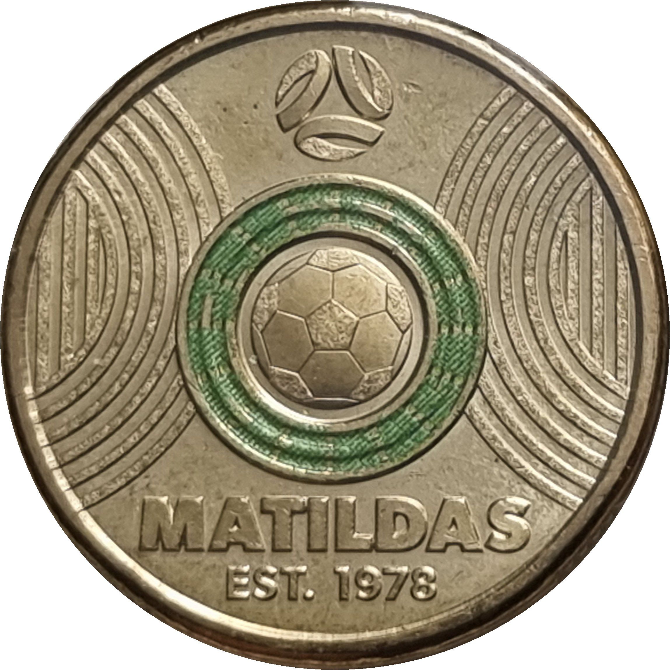 Опис: Футбольний м'яч всередині світло-зеленого кільця, оточеного круглими та прямими лініями, що символізують футбольне поле. Зверху — логотип Федерації футболу Австралії.