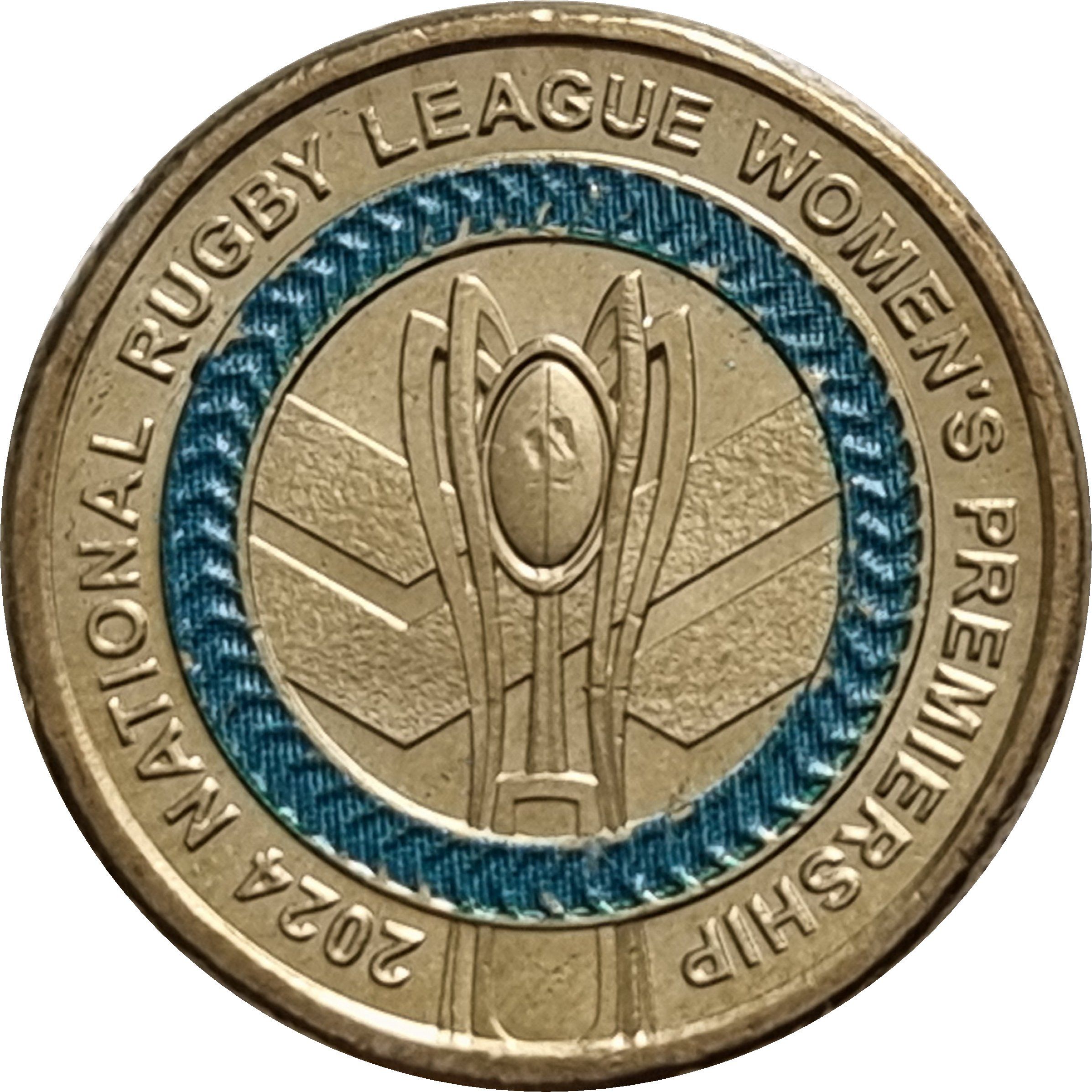 Опис: Трофей жіночої прем'єр-ліги NRL у центрі з синім кільцем навколо,