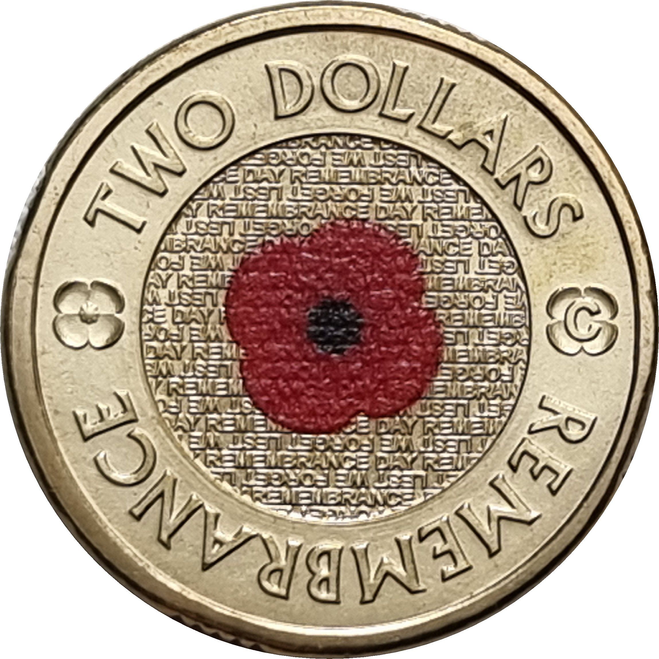 Опис: На монеті зображено мак, надрукований червоним кольором, оточений словами «Lest we forget» (Не забудемо) та «Remembrance Day» (День пам'яті), написаними повторюваними мікролітерами. Марка монетного двору «C» знаходиться праворуч від маленького маку.