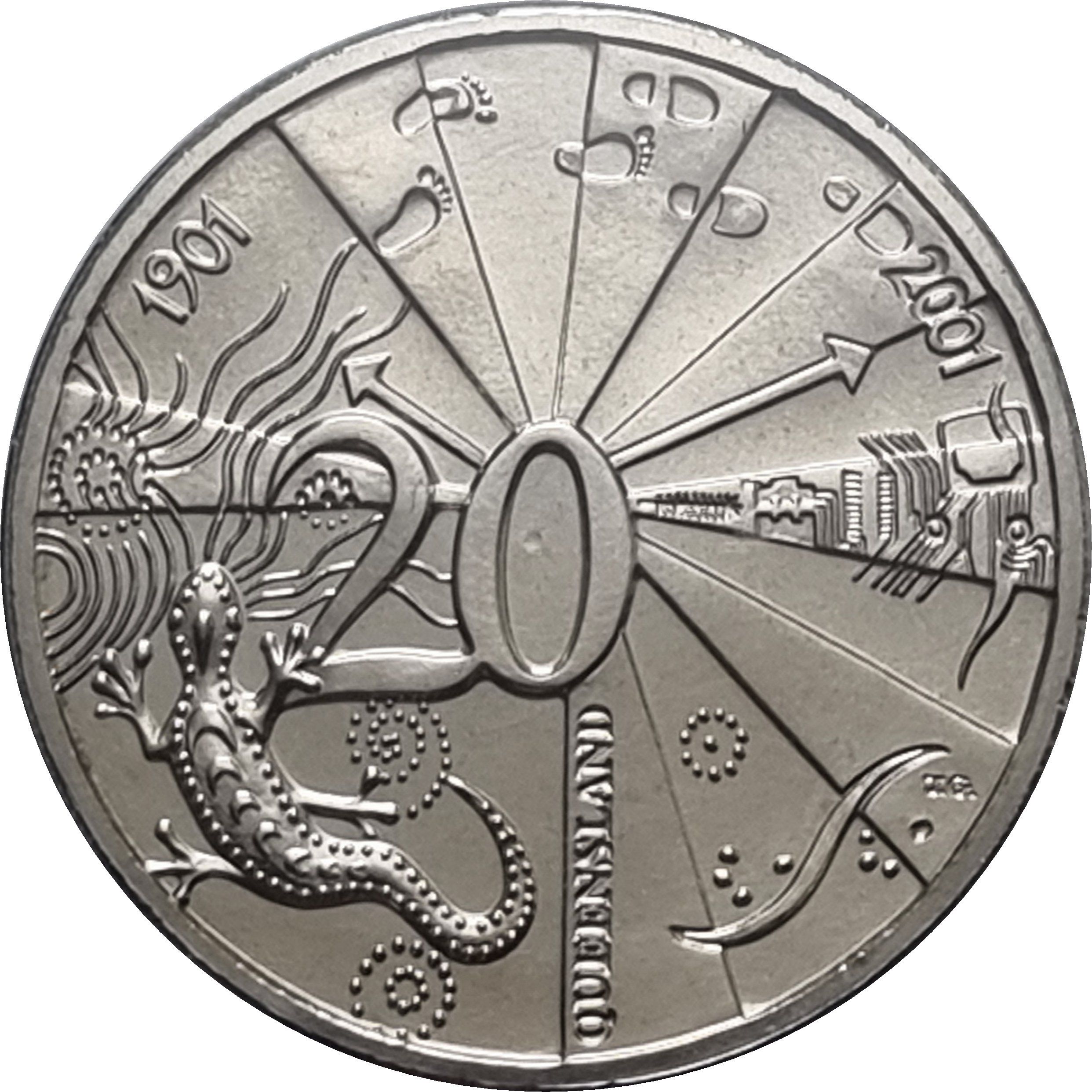 Опис: Аборигенні малюнки, гекон на південний захід від цифри 20 (валюта), стрілки, що виходять з цифри 20 і вказують на роки 1901 і 2001, сліди босих ніг і чобіт, що йдуть від 1901 до 2001 року. Зображення комп'ютерної плати, що символізує епоху технологій, спрямованих у майбутнє.