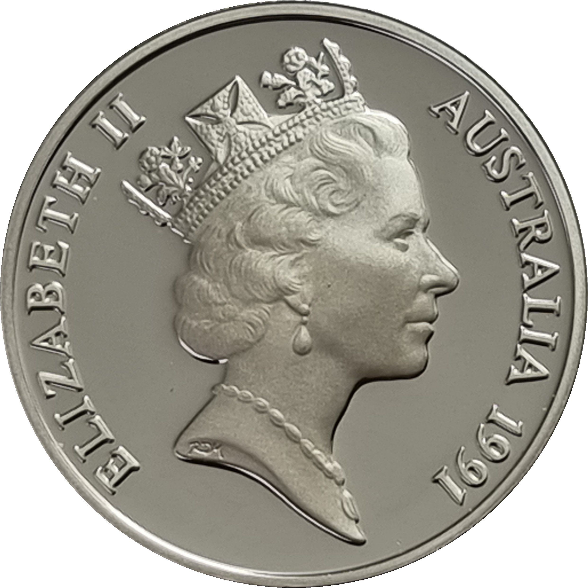 5 центів — Єлизавета II (3-й портрет — «Шедеври в сріблі»; «Ехідна» — пробна монета) 1991 – 1991 Австралія