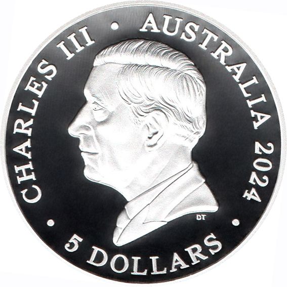 5 доларів — Карл III (1-й портрет — дельфін у вигляді пісочного годинника — високий рельєф) 2024 – 2024 Австралія