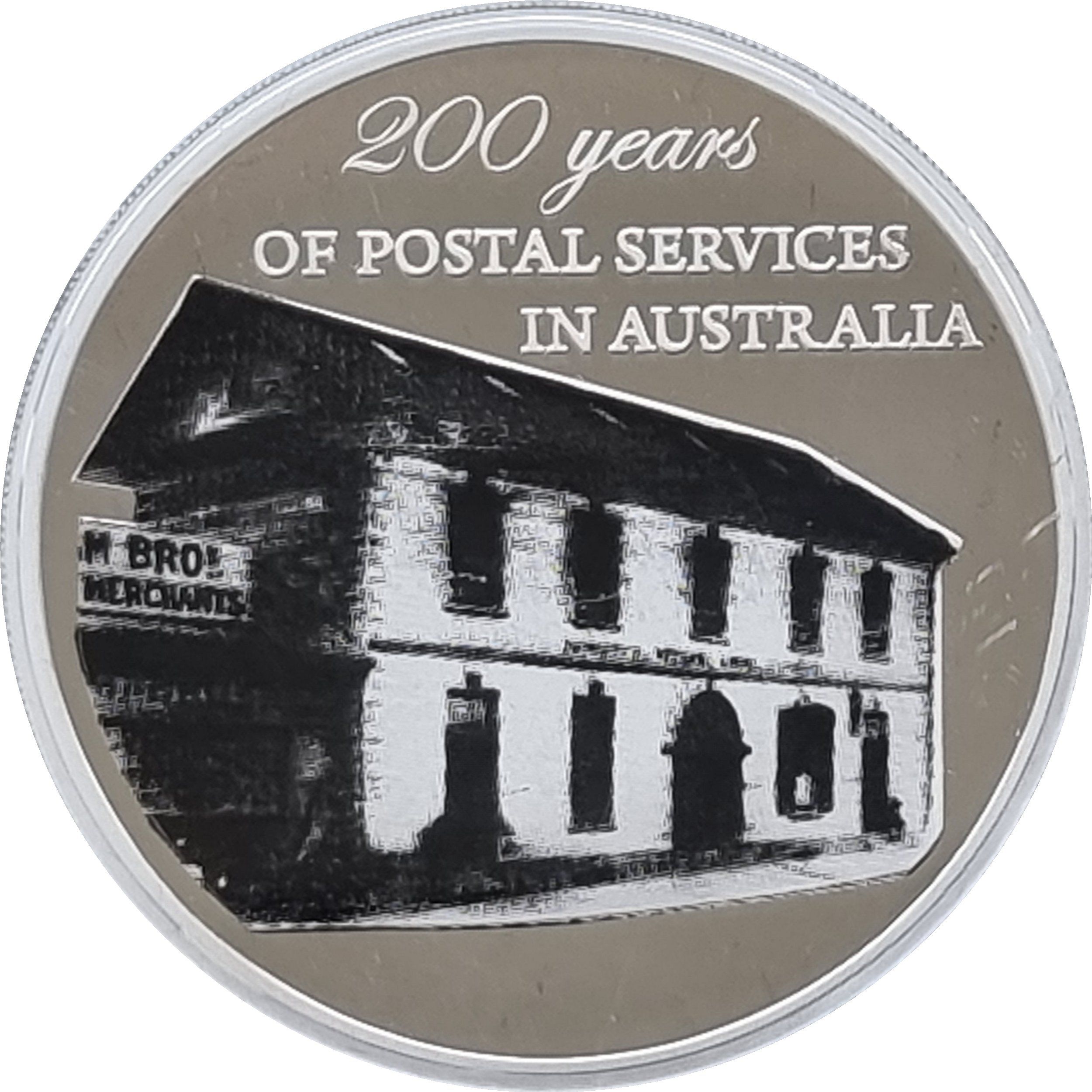 Опис: Тамподрук зображення першої поштової контори, яка була будинком Ісаака Ніколса, першого поштового начальника Нового Південного Уельсу в Австралії.
