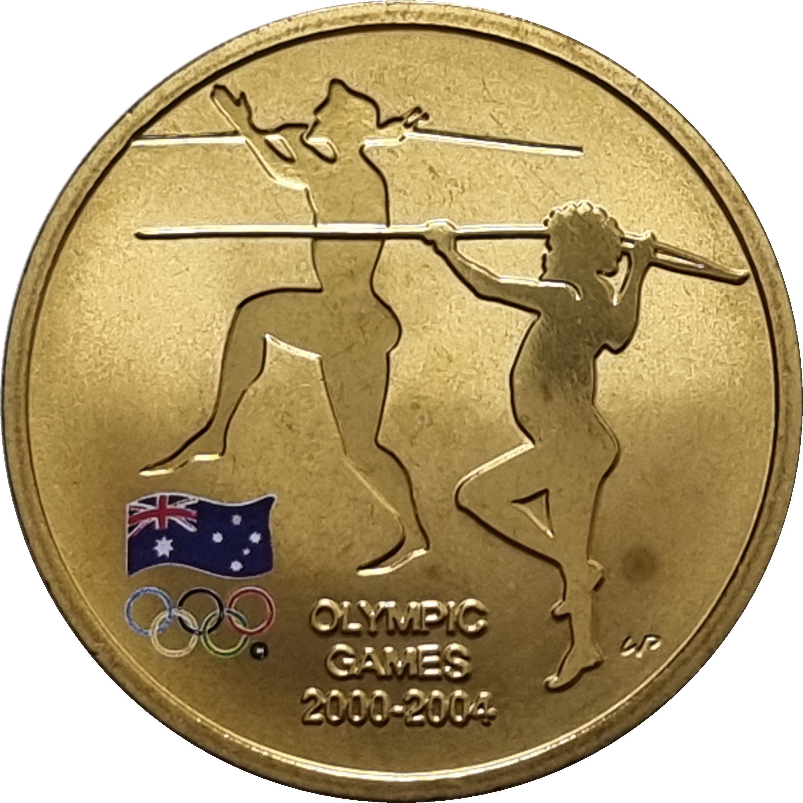 Опис: Стародавній грецький атлет, що тримає спис, та австралійський абориген, що кидає спис. Нижче зображено кольоровий прапор Австралії, а під ним — кольорові 5 олімпійських кілець.