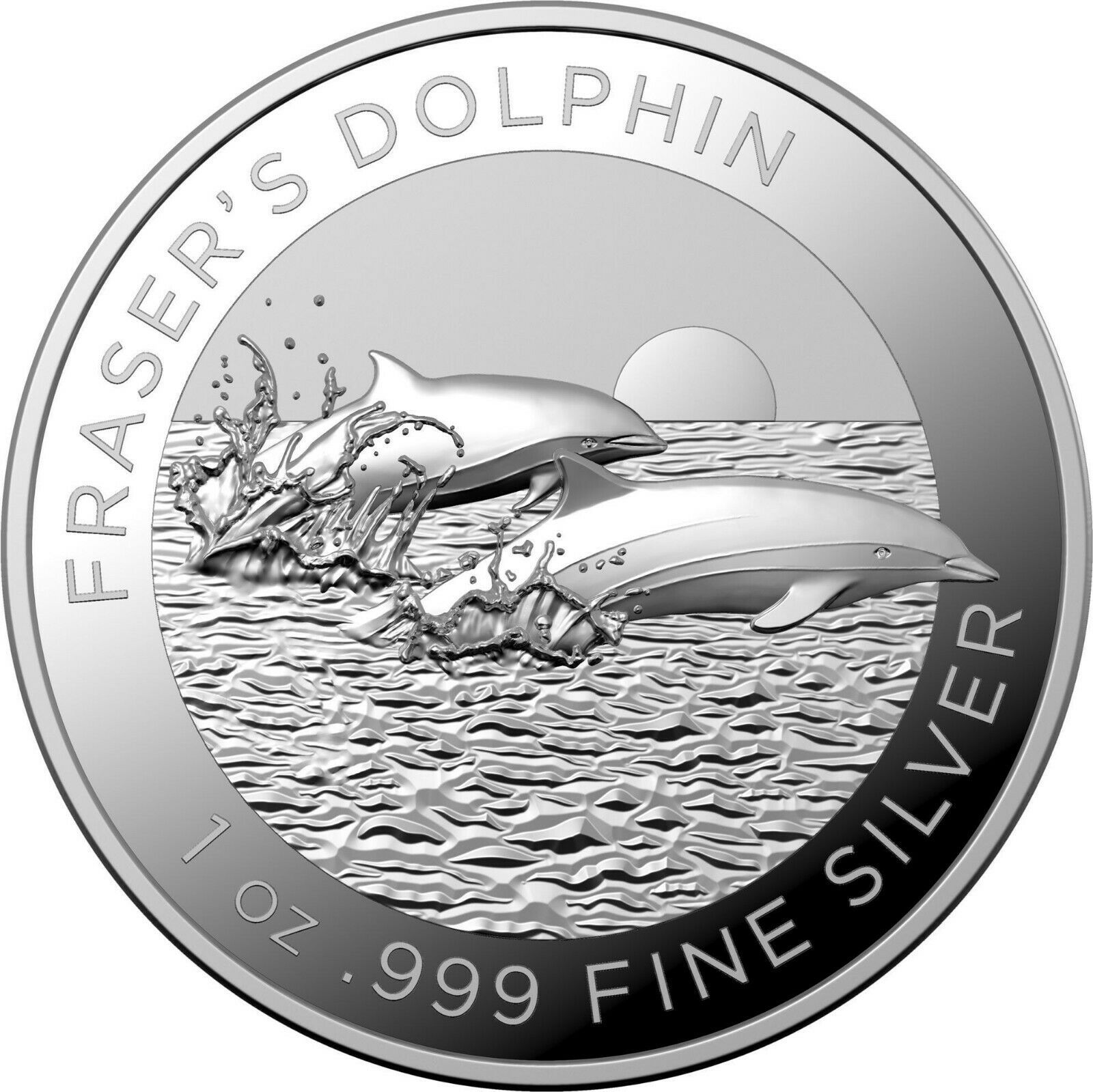 Опис: Два дельфіни Фрейзера, що вистрибують з моря на тлі горизонту. Також вказано вміст металу та його чистоту.
