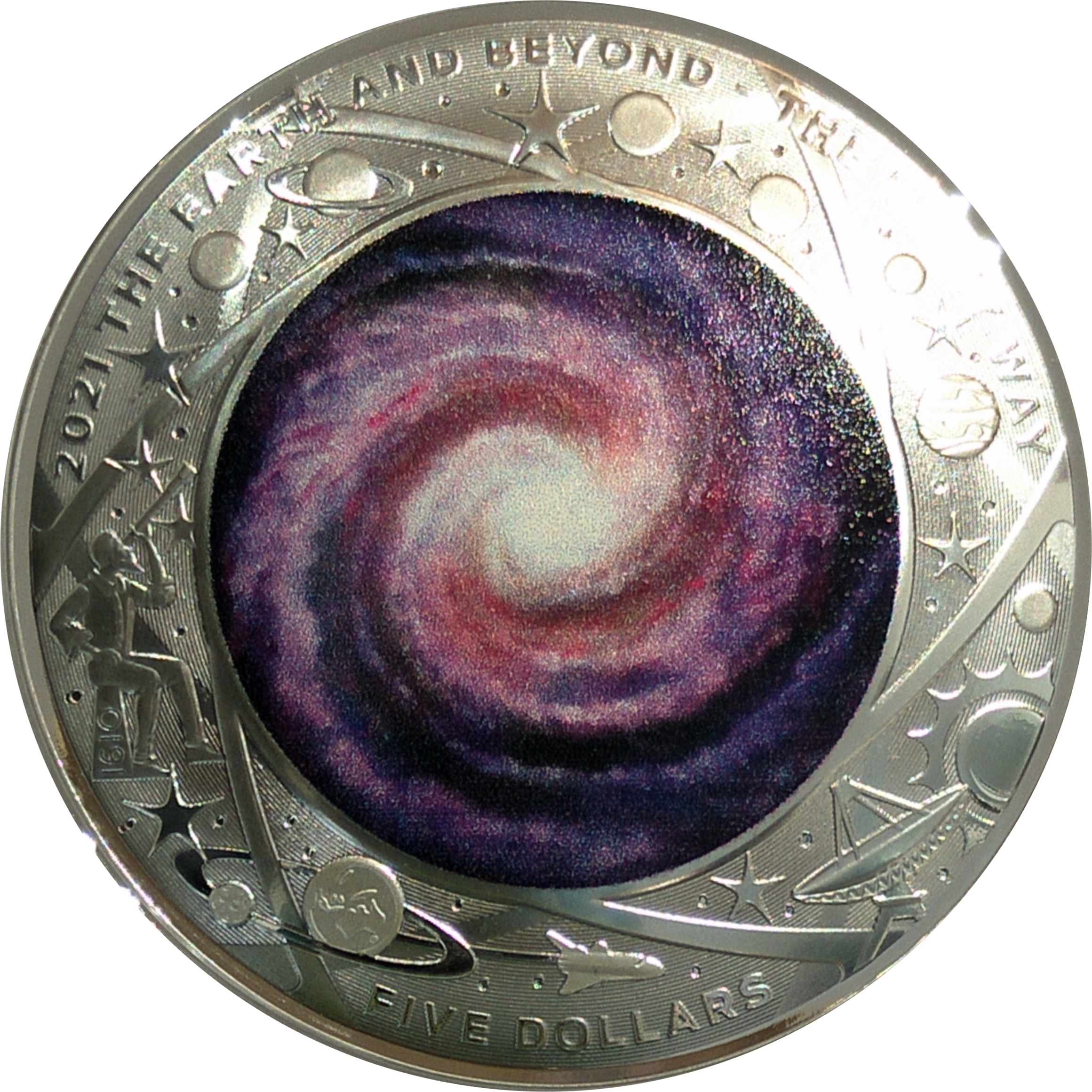 Опис: Кольорове зображення нашої галактики — Чумацького Шляху. На некольоровому зовнішньому кільці зображені астроном, радіотелескоп, ракета, зірки та планети нашої сонячної системи. Ця сторона є опуклою.