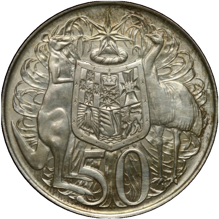 Опис: Герб Австралії (щит несуть червоний кенгуру (Macropus rufus) та ему (Dromaius novaehollandiae)) та цифра «50». Нижче — знак дизайнера «SD».