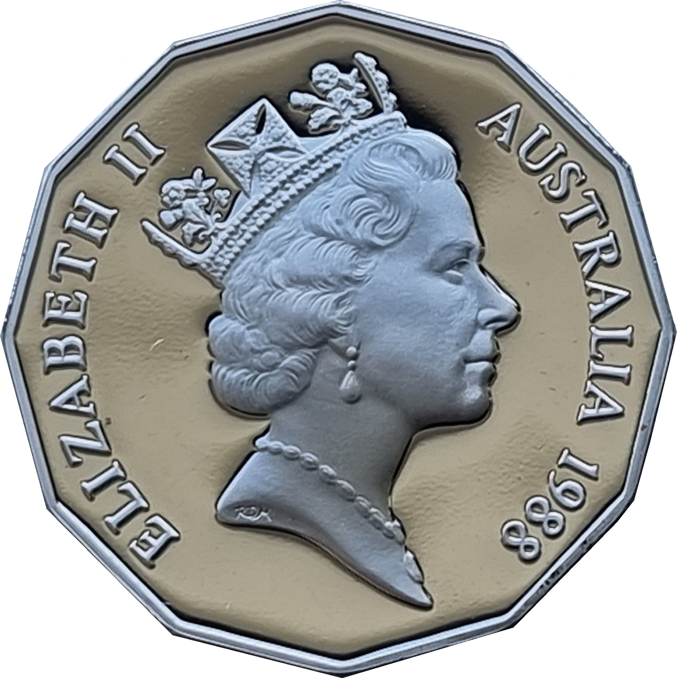 50 центів — Єлизавета II (3-й портрет — «Шедеври в сріблі»; 200-річчя першого флоту) 1988 – 1989 Австралія