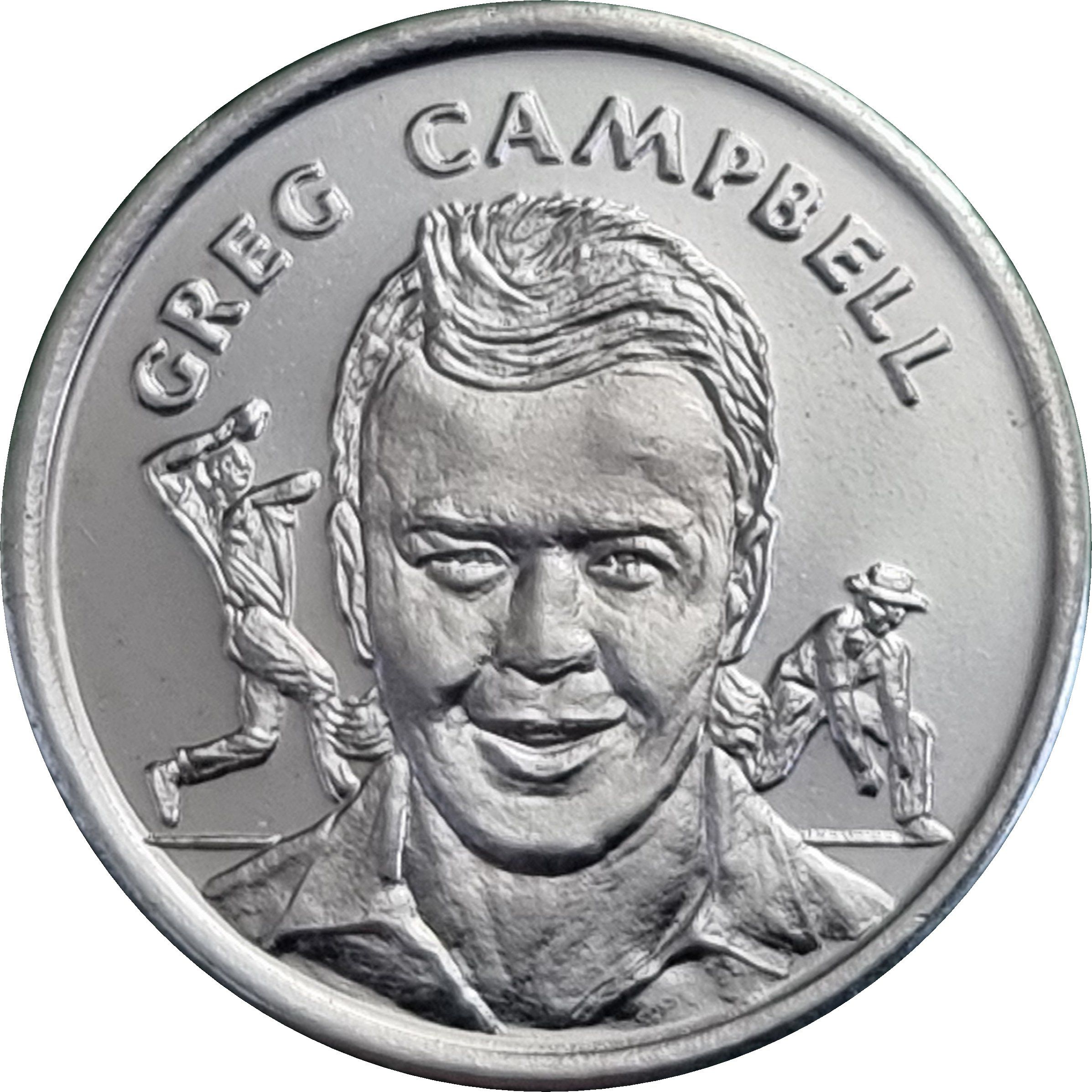 Опис: Бюст тестового крикетиста Грега Кемпбелла з боулером ліворуч і польовим гравцем праворуч.