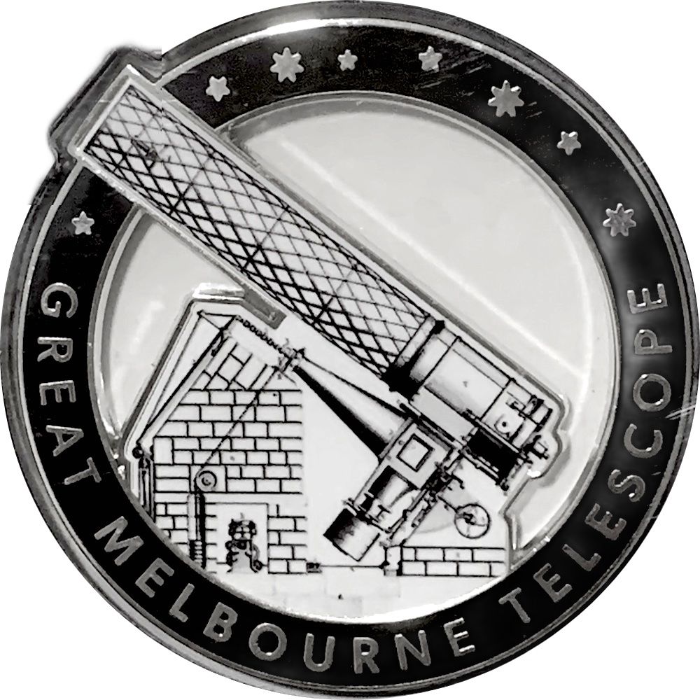 Опис: На аверсі зображено великий телескоп, спрямований вгору ліворуч, з чорною облямівкою з вісьмома зірками та назвою телескопа.