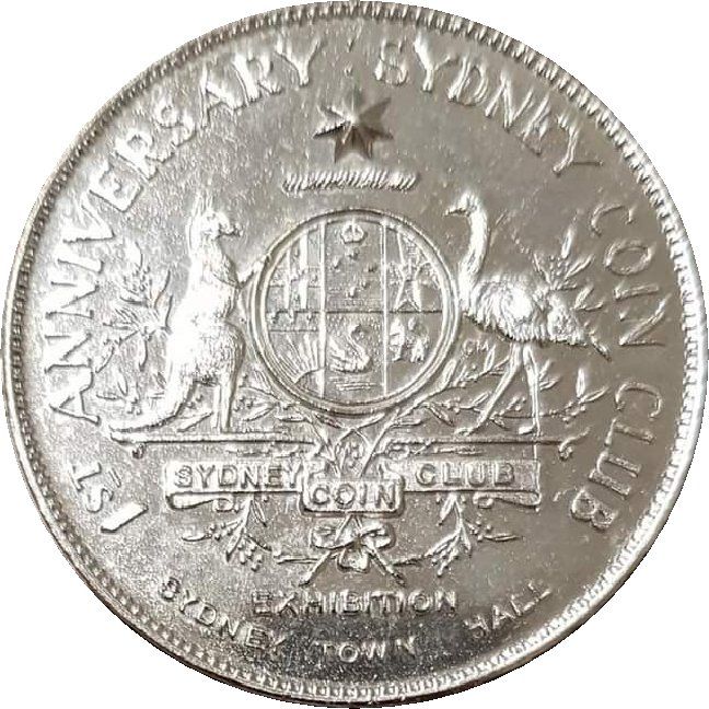 Опис: У центрі зображено герб Австралії, а навколо нього текст, присвячений 1-й річниці Сіднейського монетного клубу та виставці в Сіднейській ратуші.