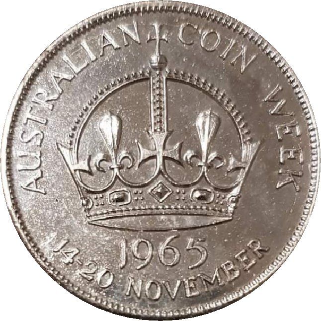 Опис: Дизайн австралійської монети «корона», який використовувався на монетах 1937 та 1938 років, з написом «1965 Australian Coin Week» (Тиждень австралійських монет 1965 року).