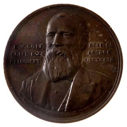 Опис: Портретний бюст Е. В. Коула, звернений на 3/4 вліво; у три рядки E.W.COLE AGED 55 / COLE'S BOOK ARCADE / MELBOURNE VICTORIA малими літерами під бюстом ініціали монетного двору S & S.