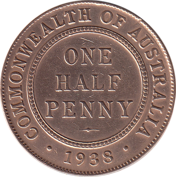 Опис: У центрі, всередині кола з намистинами, три рядки слів ONE HALF PENNY над простим сувоєм; навколо кола з намистинами — COMMONWEALTH OF AUSTRALIA . 1938