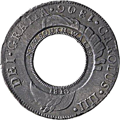 Опис: Срібна монета у формі кільця, виготовлена шляхом вирізання круглого «виїмки» з центру монети номіналом 8 реалів, викарбуваної в Лімі в 1806 році, та нанесенням штампа з написом NEW SOUTH WALES 1813 навколо центрального отвору. По краю монети-носія нанесено напис CAROLUS . IIII . DEI . GRATIA . 1806.; на монеті-носії зображено лавровий бюст Карла IIII, звернений вправо, який майже повністю видалений внаслідок пробивання отвору та нанесення контрштампу.