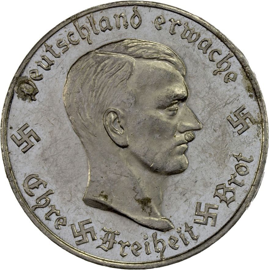 Опис: Портрет Адольфа Гітлера, звернений праворуч, з чотирма маленькими свастиками, що розділяють написи.