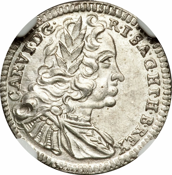 Опис: Бюст Карла VI Габсбурга, звернений праворуч. Напис «Carolus VI Dei Gratia Romanorum Imperator Semper Augustus, Germaniae, Hispaniae, Hungariae, Bohemiaeque Rex»